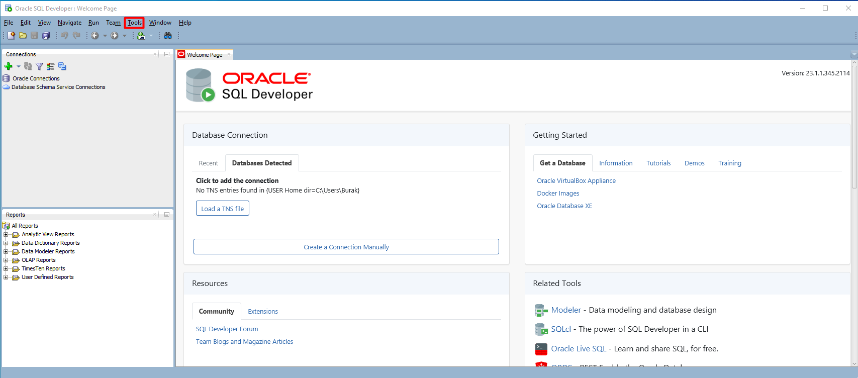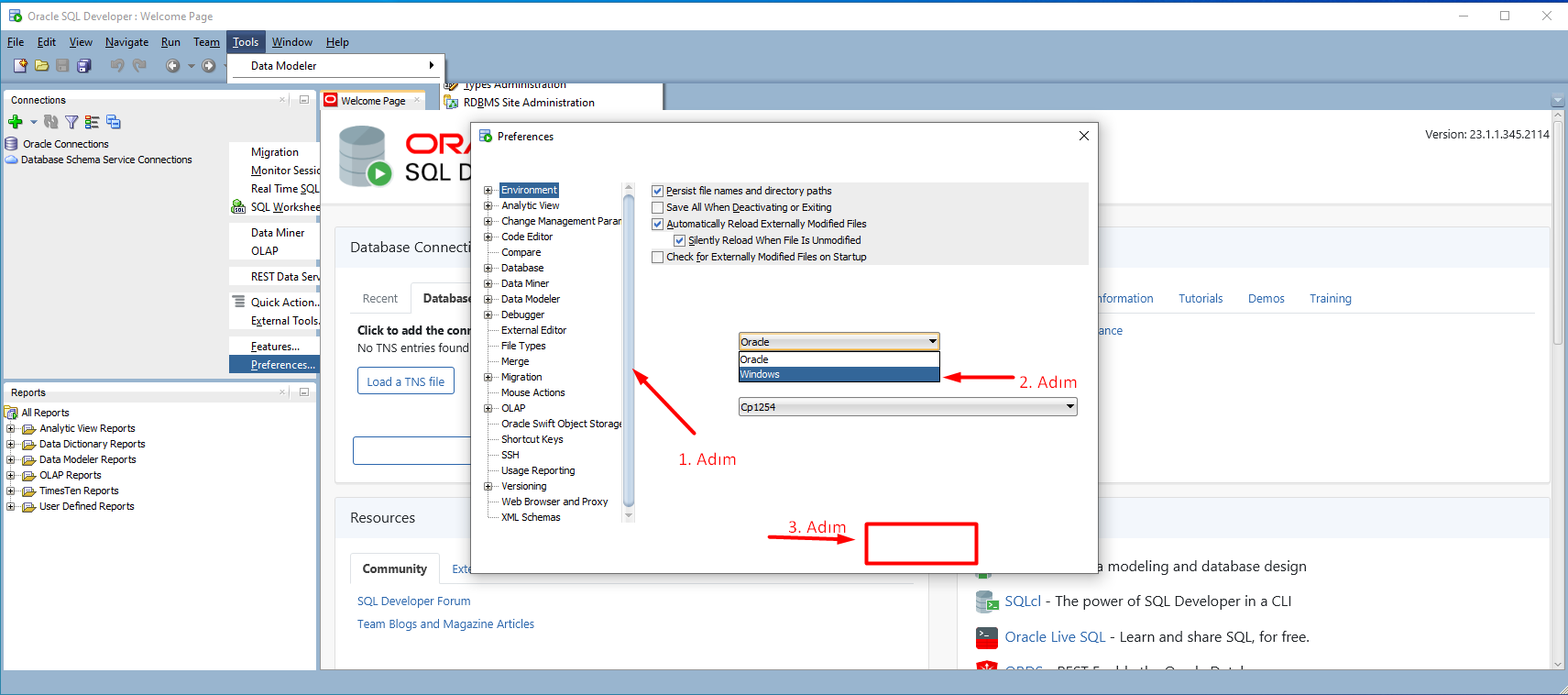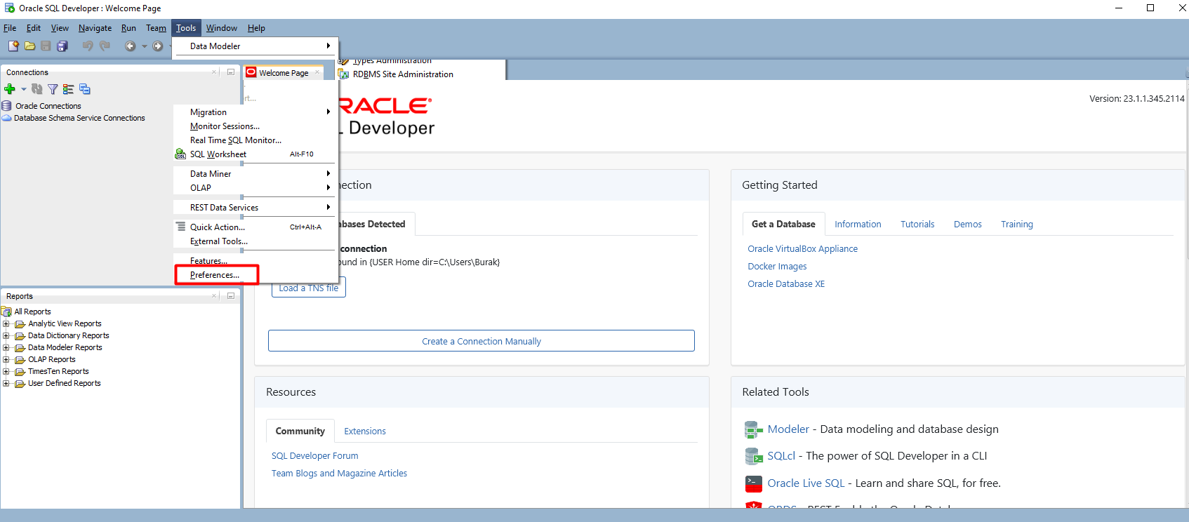 SQL Developer ekranındayken üst kısımda yer alan “Tools” menüsüne tıklayın ve farenizi aşağı doğru bir düzlem şekilde yavaşça indirin. Farenin hareketine göre seçeneklerin karşınıza çıkması sonrasında “Preferences” seçeneğine tıklayın.