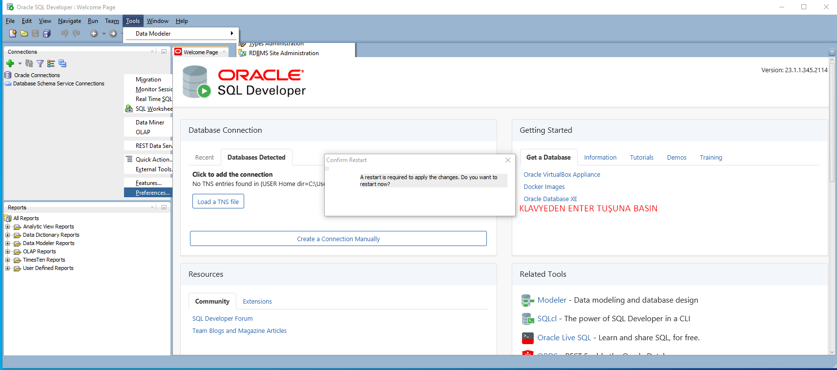 Son olarak karşınıza yine boş bir mesaj kutucuğu çıkacak. Burada başka bir yere tıklamadan sadece klavyeden Enter tuşuna basın ve SQL Developer’ı yeniden başlatın. Program artık tamamen düzgün ve sorunsuz çalışacaktır.